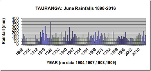 Rainfalls for the month of June have been recorded in Tauranga since 1898 – except for 1904, 1907, 1908 and 1909.