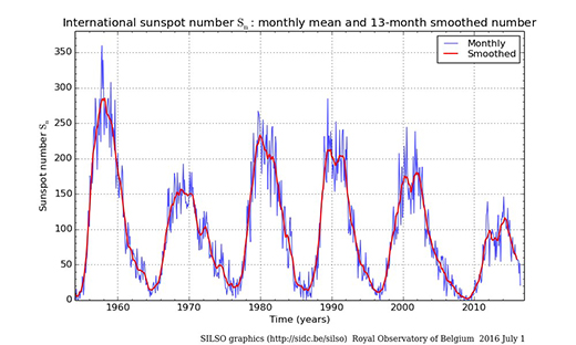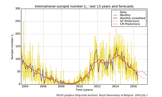 The NASA Solar Physics website (and other web sites such as the Royal Observatory of Belgium) includes information on sunspot numbers, the ‘Maunder Minimum', and sunspot cycle predictions. The sunspot index is updated monthly and available from 1749. The last time the monthly sunspot number was above 100 for any significant period of time was September 2002 when the value was 109.6, and the last time the value was above 200 was in August 1990 when the value was 200.3.