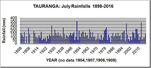 Rainfalls for the month of July have been recorded in Tauranga since 1898, except for 1904, 1907, 1908, and 1909.