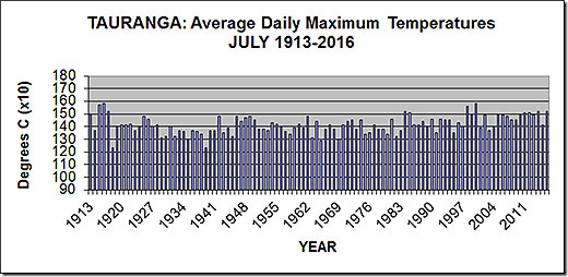 The average afternoon temperature for Tauranga for July for 49 years from 1914-1962 was 14.0 degrees Celsius, compared with the average afternoon temperature for Tauranga for July for 49 years from 1963-2011 was 14.2 degrees Celsius.