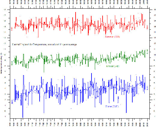 The graphs for the annual, summer and winter temperatures have been prepared using the composite monthly meteorological series, originally painstakingly homogenised and published by the late professor Gordon Manley in 1974. The data series is now updated by the UK's Hadley Centre.