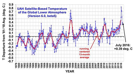 The data for 2016 is: January +0.55 degrees C, February +0.83 degrees C, March +0.73 degrees C, April +0.71 degrees C, May +0.55 degrees, June +0.33 degrees C, and July +0.39 degrees C.