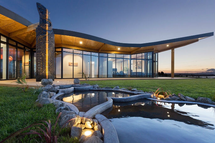 The roof is shaped in the form of a whale tail, encompassing the traditional story of ‘Te Wai o te Tohora’ – The Legend of Mangatawa. A baby whale and its parents became stranded in Tauranga harbour and were turned to stone after drinking from a magic spring, forming local hills. This legend drove a design in the shape of a whale tail, with a tall sweeping wall of glass facing the spectacular view across the Bay of Plenty. Three carved pou represent the three whales from the Maori myth.
