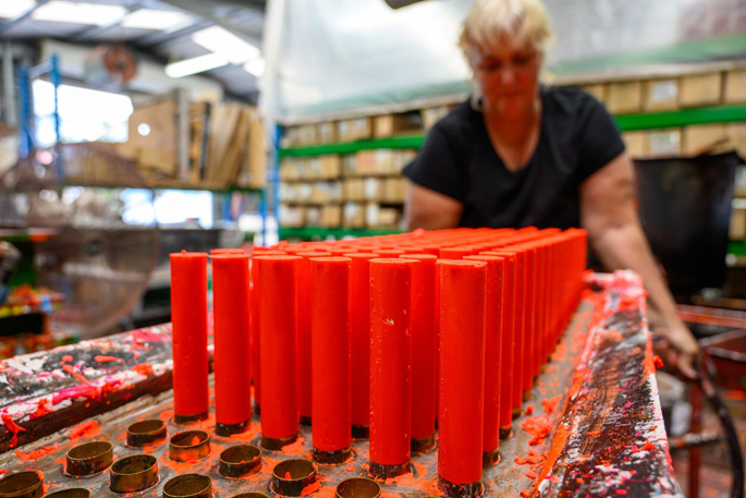 She was making 3000 giant fluorescent orange crayons for a 50-box order during the Weekend Sun’s visit to the Pyes Pa warehouse.