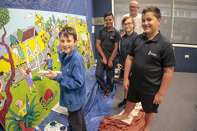 Timo Rannali is helping kids at Tauranga Primary School create a mural depicting their school and local community. It will be installed on an external classroom wall in September.