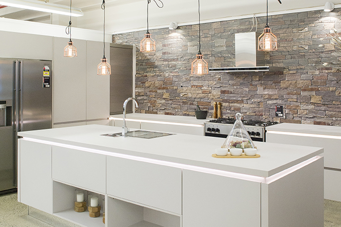 The kitchen displays also feature granite, engineered stone and quartz, and several acrylic finishes including Corian.